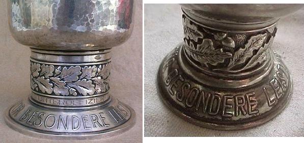 Perhaps of greater concern to collectors, however, is the so-called "up-graded" Honor Goblet. With these forgeries, the original recipient's name is erased and replaced with that of someone deemed to be more 'famous', for example, a noted Ritterkreuztrager. One of the authors has identified two examples which may have been enhanced in this way. Photographs, however, can not be published. If you see a goblet for sale purporting to be that of a 'famous' airman examine it very carefully.