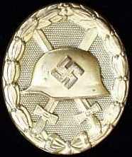 The gold grade was initially manufactured from gold plated or polished brass (as result of the polishing some of the badges lack pebbling and are almost flat). The reverse was again solid with the same pin characteristics and marks as the Silver grade. It was awarded for five or more wounds, and was also awarded for serious wounds in cases of total blindness or total disability. It should be noted that both Silver and Gold badges were also made from gilt-washed zinc as the war progressed. By 1945, as quality became less important and materials scarce, some black badges were being painted the appropriate color and issued as both silver and gold grades. In these cases the reverse is almost always hollow.