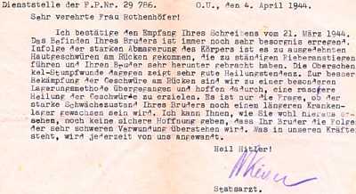 Staff Doctor Keitel, Field Post Office Number 29786, May 8. 44 My dear Mrs. Rothenhoefer! I acknowledge herewith the receipt of your letter dated Apr 28, 44. Unfortunately, your brother's condition has become so bad that little hope exists that he will recover from his serious wounds. It seems that blood poisoning has occurred which can not be stopped. For this reason I did not give him your letter which contained word about the death of your (HIS) Mother. I hope to have acted according to your wishes. You can be sure that in spite of the hopelessness, we are doing our very best to keep your brother alive. With devoted greetings and Heil Hitler, (SIGNATURE) Staff Doctor and Chief of the Surgery Department |