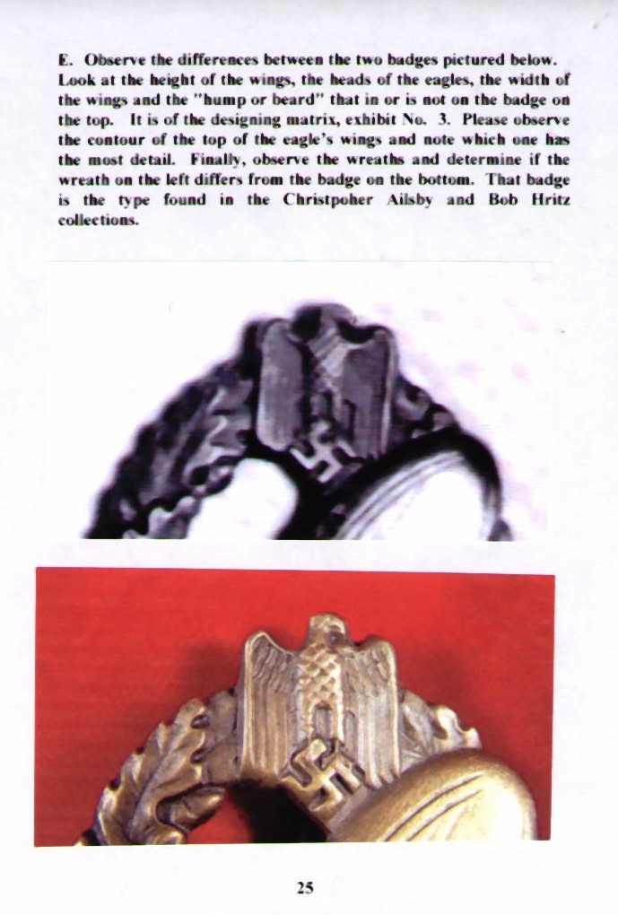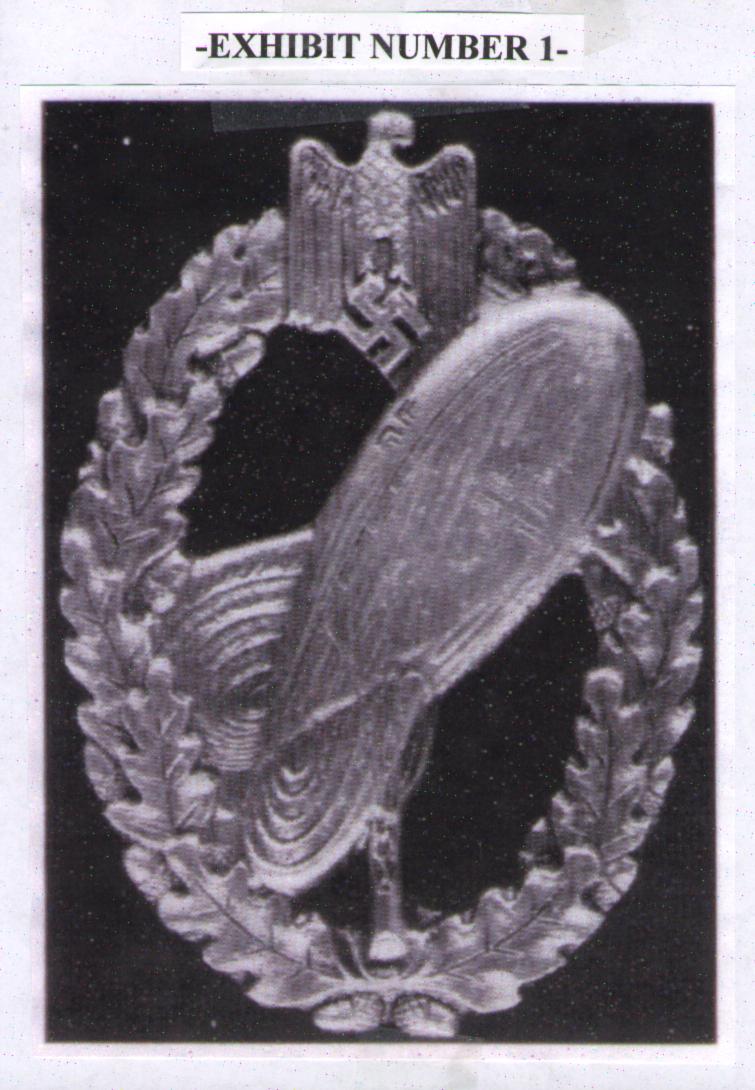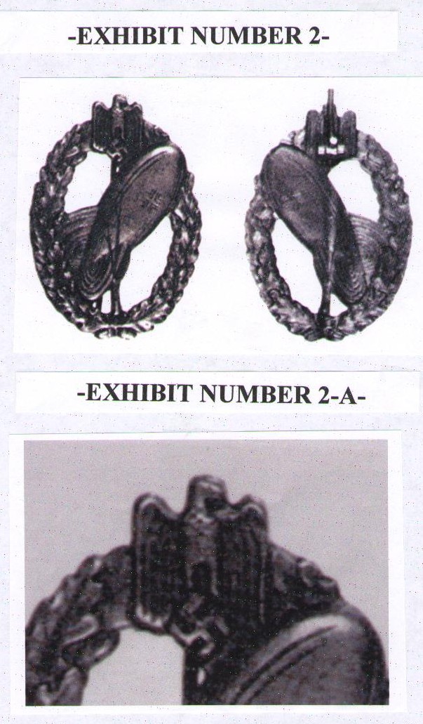 As stated earlier, and as Exhibit No. 1 shows, Dr. Klietmann said that this badge was the original design approved by the Reich’s Orders Chancellery prior to the end of the war. Note the design of the eagle and how the head rises well above the neck and wings. However, the left wing is slightly wider than the right wing. (See Exhibits No. 1, close up of the eagle.) In Dodkins and Littlejohn’s book the design of the eagle’s head changes to appear that the eagle’s left wing is the same heights as the right and the beak appears to be looking at the "beard or hump" on the top of its left wing. (See Exhibits No. 3 and 3-A) John R. Angolia used the same photographs in his 1976, 1985 and 1987 revisions. (See Exhibits No. 2 and 2-A)