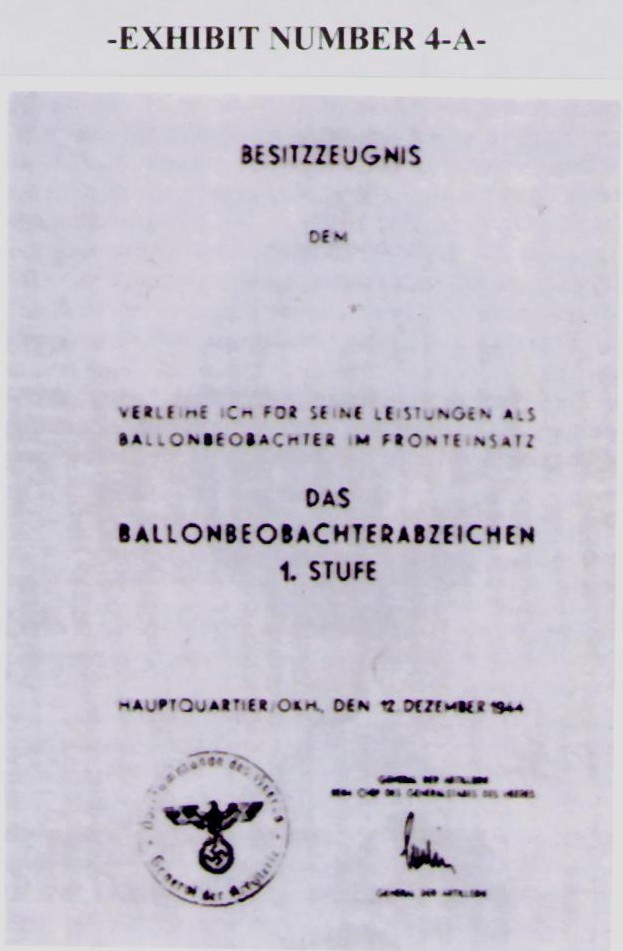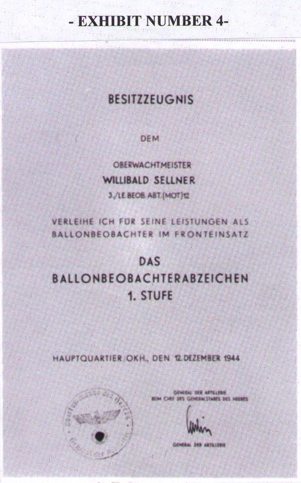 1. A case in point is the document awarded to Willibald Sellner, December 12, 1944. (See Exhibit No. 4. And 4-A) However, this is the only such documentation that I have seen and it is credited to Dr. K. G. Kleitmann. In the German text, by Nimmergut, "DEUTSCHE ORDEN UND EHRENZEICHEN BIS 1945, Volume 4, page 2329 - 2331, you can read additional information about this badge. A most interesting photograph of a blank Urkunde is featured on page 2230; top left of the page. If you will compare exhibit No. 4 and 4-A you will see that the documents are the same. They are the same except for the one Dr. Klietman presented in his 1981 book is filled out to Willibald Sellner. The swastika in the stamp has been obliterated in the Klietmann presentation. However, on the blank document, the stamp is placed in the exact and identical location on the document with no obliteration of the swastika. Finally, the signatures on both documents are signed EXACTLY the same way. Need I show more or say anything that any logical minded person needs to see to decide at this point concerning what we have with the two documents? They are one in the same with the name blocked out and the swastika obliterated to not violate German law regarding the display of the banned emblem of the Third Reich or a deliberate forgery.