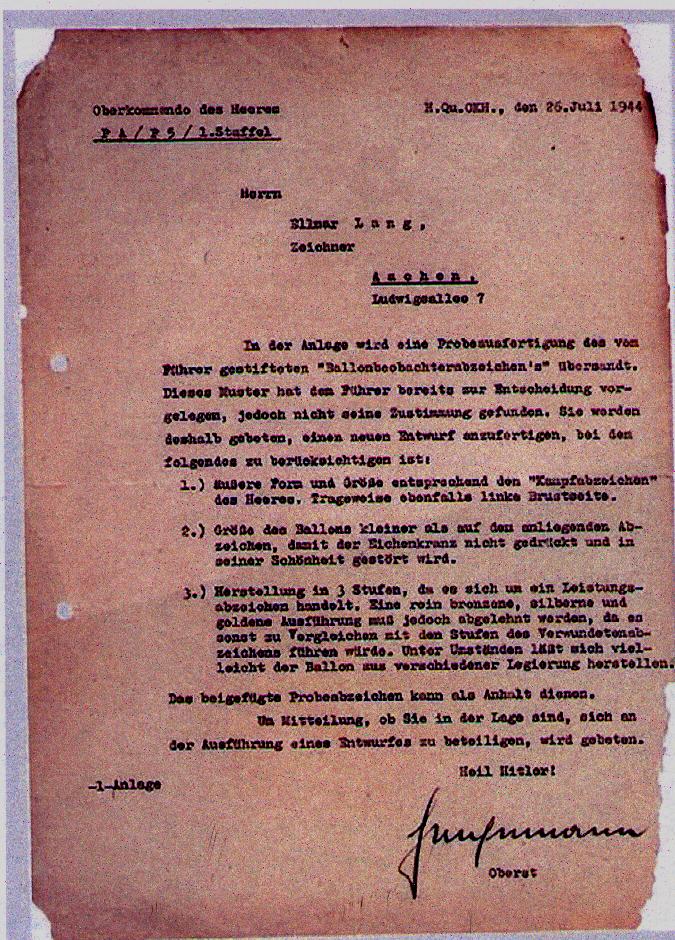 2. The badge was not ready in July to be presented to the troops. It has been verified, as of July 26th, 1944, that the Reich’s Orders Chancellery had not approved the badge design. The High Command of the Army had notified the designer of the badge, Ellmar Lang, Acchen, that the design he had submitted had been rejected by Adolf Hitler. He was given suggestions on how to improve the design to meet Hitler’s requirements. Two samples had been submitted by the designer, Ellmar Lang to Oberst Froben, and Froben department rejected one design and choose the other and ordered "twenty to forty of each grade" to be produced by "a jeweler in Dresden". He left his position as Director of Group III (Reconnaissance/Observation Branch of the several branches making up the artillery arm) in "early 1945" and no badges had been received at that time. (See Exhibit No. 5.)