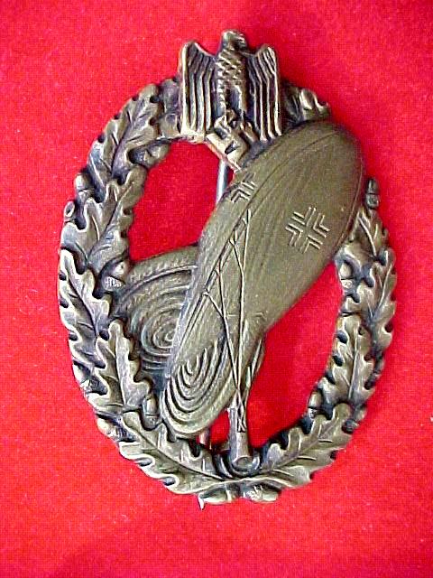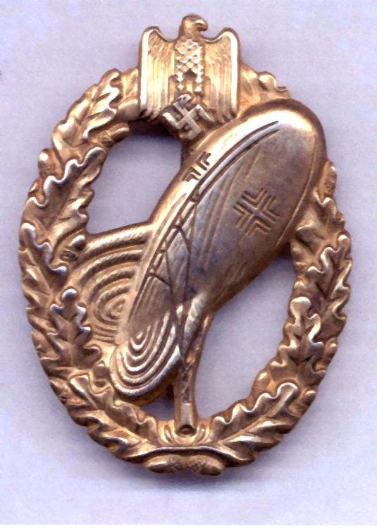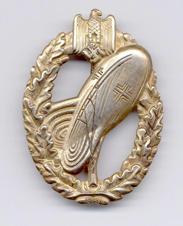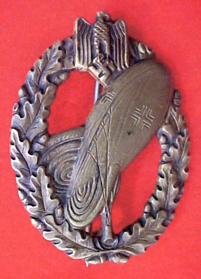 Now I had to envision what bestowal criteria for the performance evaluation of balloon observers on active front line duty were to be. Because I myself had no experience as an observer I effected the detachment to my staff of an experienced officer, Oberleutnant Uhde who was soon presented. As a result of out consultations and calculations we established criteria based on a point system. Thereby the importance of the observer reports and the targets engaged for the high command, and for the troops directly supported as well as the personal effort of the observer, were evaluated. Duration of the observation mission and the exposure to enemy planes or artillery played a role also. For example, every enemy target engaged and every four hours observation duration recorded were valued at one point. The first evacuation by parachute during a combat mission for compelling reason, brought ten points and every subsequent one five points were received. Three grades of the badge were established: Grade I in Bronze for twenty points, Grade II in Silver forty-five points and Grade III in gold seventy-five points. Only the highest grade awarded was to be worn on the left breast, if applicable to the left of the Assault badge. All this was brought into agreement with the awards section and it was able to judge this aspect: artillery commanders (division/corps level), commander of the observation battalion or the battery commander. Basis for the evaluation was to be the Balloon diaries kept up at platoon level. The applications for the award were to be made to the "General der Artillerie" in the OKH. From there the award document and the badges were then to be sent directly to the applying formation.