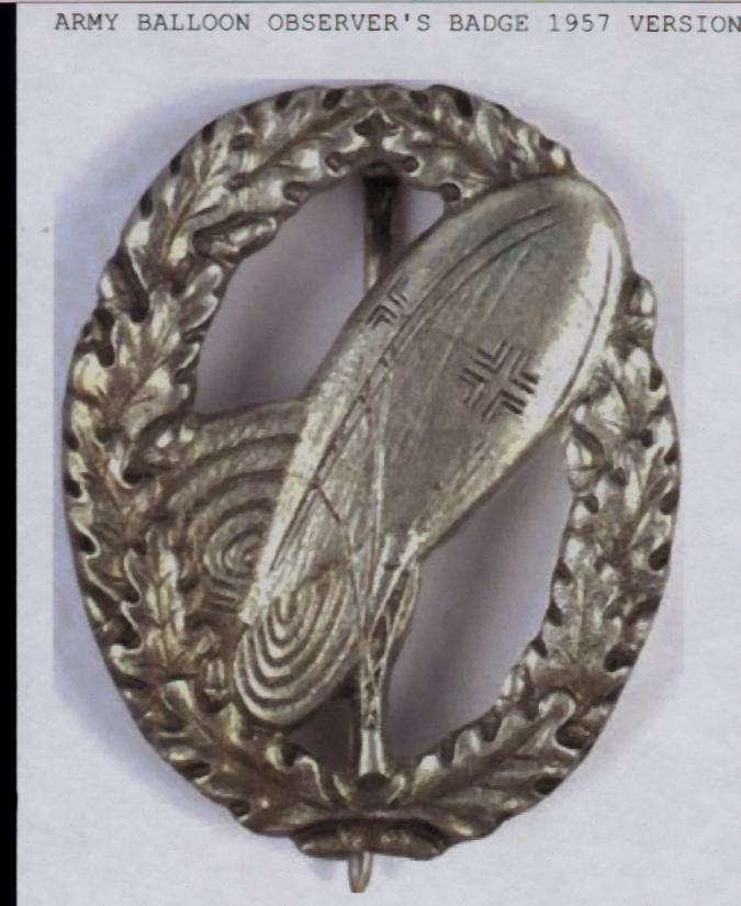 5. The hidden truths and the speculations that still tend to cloud what the exact approved design of this badge looked like may be erased by looking at the design of the 1957 reissue of the Army Balloon Observer’s Badge. Logic dictates that the Bundesrepublic of Germany had to have had access to the Order’s Chancellery archives to obtain the design of the Army Balloon Observer’s Badge to reissue it in 1957. Today’s researchers trying to obtain these records are faced with a major obstacle. Otto Spronk stated the following during one of our discussions about this problem. He said, "I think without some extensive archive-research it would not be possible to find the date of approval and maybe the design drawing from which a die would have been made. In the years after the fall of the Wall the Germans reorganized their archives. All Nazi-time related archives are now it Potsdam, near Berlin, and not in Koblenz anymore. The Military-archives are still in Freiburg, but all archives are still suffering from the moves and many of the old archivists who knew their stuff did not move to Potsdam. Now no one can find anything anymore. It will take some 30 to 50 years, maybe more, before they will have an easy access again." It appears that most of the work they are doing involves rearranging all the archives from both the former Democratic Republic of Germany and the Bundesrepublic.
