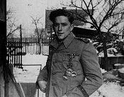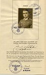 | Photo of the recipient and completely typed AFRIKA award document rendered to an Oberleutnant Edmund Schaefer. Schaefer began his career as an enlisted soldier in Schutzen Regiment 115 of the 15th Panzer Division, which later went on to become one of the two panzer divisions to comprise the famed Deutsches Afrika Korps (DAK). The document is typed in 'regulation format'. This practice was not uncommon, especially towards the end of the war or during periods when units were in action and supplies of preprinted documents were not easily obtained. All service's regulations (in this case it would have been the "Heeresmitteilungen") were published, compiled and annually updated in a record book. These record books of regulations would have been present in most all units. When a new award was entered in to the regulations, a basic format for the wording of an award document was included. It was from these formats that clerks found the correct reference for hand-typing award documents. |