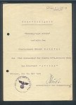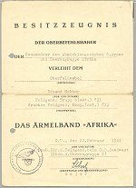 The award of the AFRIKA cuffband was accompanied by an award document, or "Besitzzeugnis". In some cases, such as prisoners of war, this is all that was received. A portion of these latter cases were actually received through Red Cross mail while the recipient was in a POW camp in either the US, Canada or England. Like most award documents, the document for the AFRIKA cuffband was issued in a variety of formats. However, while none are easily available today for collectors, at least four styles will be encountered. These range in style from the plain text message format - the most scarce of the three - written on half sheets of paper, regulation formatted but completely unit typed, to the more formal, preprinted documents, with or without the image of a palm tree - the former being the most desirable and the latter being the most common version.