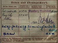 Although instituted 15 January 1943, it is unlikely that more than a handful of awards were issued in North Africa before the general surrender on 6 May 1943 and the final capitulation on 13 May. The few short months between institution and capitulation would have been insufficient for the manufacture and distribution to North Africa of the cuffband. This would certainly have been made all the more difficult by the tenuous supply line through the Mediterranean and the challenges faced by the German forces in their final weeks of battle. Earliest known awards show as having been made in May 1943 and these seem to have all been made to Luftwaffe personnel who were probably members of Luftwaffe units stationed in or already evacuated to Italy and Sicily, as the award documents show a facsimilie of Fieldmarshall Kesselring's signature, who at the time was the Supreme Commander of the Southern theater. However, in the eighteen months that followed the end of the North African campaign, the approximately 100,000 men who had served in the theater and were located in Europe at the time of the surrender were tracked down by the OKW and, those eligible, received the award. These men were, for the most part, wounded or ill veterans who had by this time been transferred to other units in other theaters. Others were on leave, being unable to return to their units fighting their last battles in Tunisia, or who had earlier been transferred out of North Africa. The awards were usually made under the name of Army Group Africa (Heeresgruppe Afrika). These former members were tracked down all the way through 1944. Below is an example of an officer who arrived in theater as a replacement, served, was wounded, returned to Germany to heal, and was later tracked down and notified of the award of the AFRIKA campaign cuffband.
