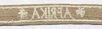 | A poor quality fake. Many such reproductions can be marketed as private purchase or POW made. While either are possible in this particular case, I believe this to be a reproduction. As noted, original AFRIKA cuffbands are only scarce rather than rare and a collector has a good chance of obtaining a regulation, issue piece so, does not have to guess on pieces such as this one. Below is the reverse of the poor quality copy. |