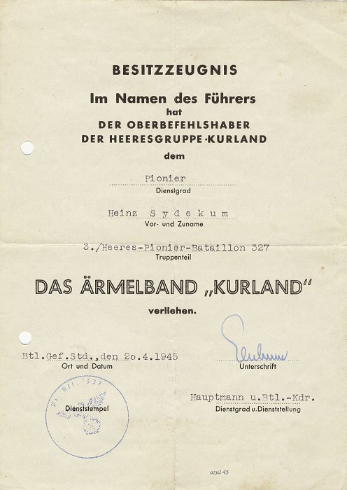 The award was made in the name of the Fuhrer, but was bestowed by the commander of Army Group Courland (Heeresgruppe Kurland). From known originals, it appears that the signing authorities ranged over a wide array of ranks, from flag/general officers to field grade officers in a variety of positions, which varied as well according to the particular branch of the Wehrmacht. This was not always the case with awards - some having definitive issuing levels - which tends to help in establishing authenticity of a document. However, due to the conditions in early 1945, it makes sense that the KURLAND band would be awarded under a variety of authorities. Issue locations varied as well. Readers can refer to the Association web article on the AFRIKA cuffband for more complete information as to meanings of abbreviations of issuing headquarters.