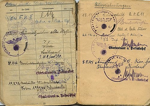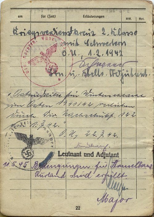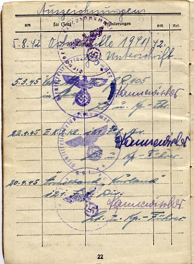 The awarding of a KURLAND band was also noted in a member's Soldbuch and Wherpaß. Entries in the latter appear more rarely. Wehrpaß books stayed with the units, whereas the Soldbuch remained on the soldier. Many units, on order from Heeresgruppe Kurland destroyed their records in the final days of the war. Regardless, the typical entry would show on page 21 or 22 of the Soldbuch and state: the date of issue - ärmelband ,, Kurland" - and the authority/officer that made the entry. Again, the latter will vary. Pictured below are several Soldbuch entries.