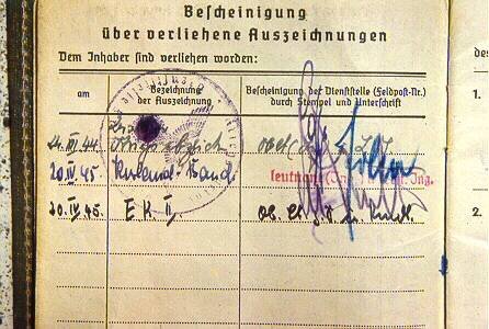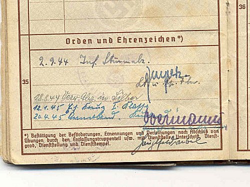 | Unteroffizier Walter Augustin served on the staff of the 24. Infanterie Division when it fought in Courland. The 24. was another division with a distinguished combat record and proven reputation, fighting in Poland, the Crimea and, for the last two years of the war, as part of the Germans' northern armies. It went in to Soviet captivity after the war's end. Augustin received an entry in his Soldbuch on 20 April 1945 - again, a very common date related to the awarding of this decoration. He was a well-decorated veteran of the entire war receiving the EK II on 12.12.39, the Ostmedaille on 15.3.42, the Rumanian Anti-Communist Medal on 17.11.42, the Krim Shield on 30.12.42, and the KVK II on 20.4.45 along with his KURLAND band. It is interesting to note that an entry made on 14.5.45 records that his Wehrpaß was destroyed in enemy fighting (Feindwirkung ) on that date…evidence that shows not all forces capitulated on 8 May 1945, especially in Courland Soldbuch entry - Courtesy of ERICH CRACIUN /Old Europe. This authorization is only valid for publication on WEHRMACHT AWARDS. |