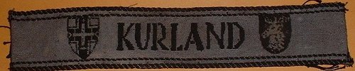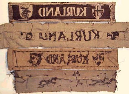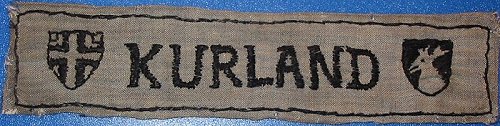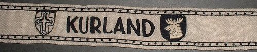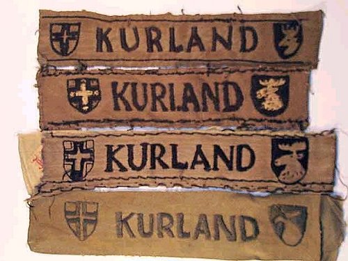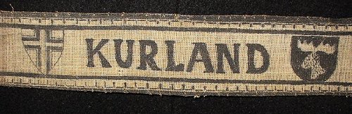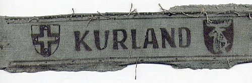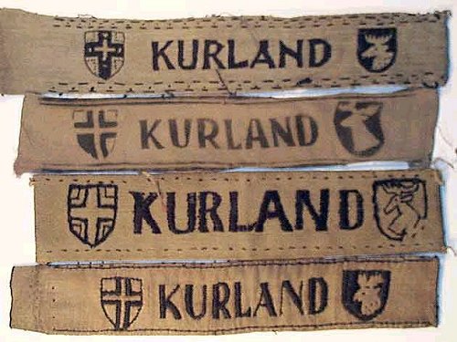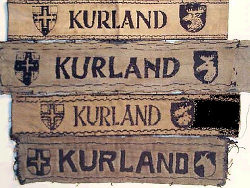 A possible explanation for both the variety of these short style bands and their sloppy construction may be based on the effort taken within the bridgehead in 1945 to meet the requirements to issue a band to each member of Heeresgruppe Kurland . It seems possible, that with a strength of about 270,000 members and the rush to produce the cuffband, that the Kuldiga source of local manufacture was insufficient to meet demands. Thus, additional bands were made by smaller, 'cottage industries' for whom which materials would have been scarce. The pattern design would have been easily disseminated (and judging from the various interpretations of the lettering and the shields, probably done even by word of mouth) and the local population - even unskilled laborers - would have been eager to perform any work that could result in compensation. Like any KURLAND band, few of these small business versions would have actually made it to the front lines to ever be bestowed. With the liberation of the Baltic states and the collapse of the former Soviet Union in the 1980s, the former Iron Curtain satellite countries soon discovered the western appetite for WWII German militaria, and the collecting market suddenly had a relative wealth of this rare cuffband available - examples that may have been kept and stored for years in any number of small businesses, as well as supplies of the 'official' Kuldiga version included.
