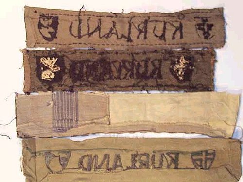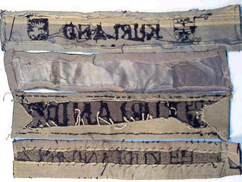 Four examples of the short style, locally produced band. The top-most KURLAND is the 'official' style described in detail above and is a good contrast for comparison with the others. The other three pictured are each embroidered and not machine woven and are considerably cruder in construction. Note the variety of the top and bottom borders.