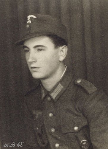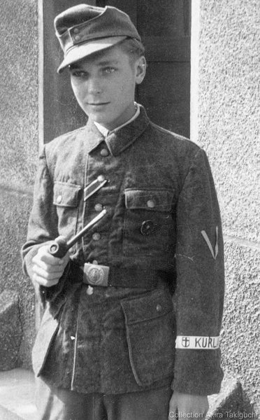 This young Gefreiter properly wears the KURLAND band, which looks to be a full-length version. The absence of the breast eagle, cap eagle, collar litzen, and shoulder straps on his M43 uniform suggesst the soldier had the photo taken sometime after the war. His band looks non-standard and the title design somewhat simplified. It may be hand embroidered.