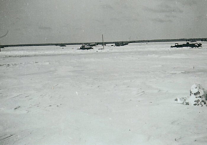 This picture shows the improvised airfield at Cholm, this picture is also from the first part of the battle (snow). In the foreground we see the so called "Rollbahn" can be recognized by the vehicles that stand in the snow) that formed the defense line on this part of the city and more distant e can see at least 2 Ju 52 transport planes (one in white and one in normal colours)