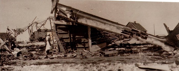 Picture from a near totally destructed glider plane Type Go 242 , note how tiny the soldier is who stands and looks at it, he is wearing again a white piece of cloth (parachute silk).