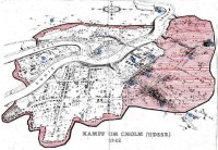 Cholm was a little Russian city of about 10,000 inhabitants during peacetime. It was divided into 2 parts by the Lovat River, which had high beddings. Although most of the houses were made out of wood, some of the larger buildings were constructed from stone. These included some dignitaries houses, the Church (used as artillery observer point), and the former Russian Prison (called "GPU Gefangenis"). The last mentioned building became a main defending post and proved of capital importance in holding of the city (see number 2 on the map). The pocket Cholm can be divided into 4 sections (or in German "Abschnitte") namely, North , East, South and Western Part. The main battles from the pocket Cholm took place in the East part. Looking at the above maps it can be clearly seen that it was in this section where the German troops lost the most ground, and consequently it was in this section that most Germans where killed during the siege.