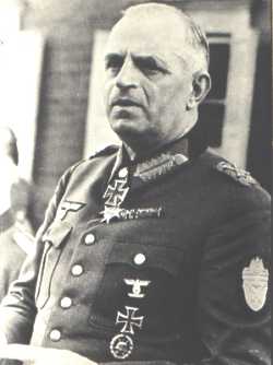 Heer/Auxiliary Luftwaffe Company commanders were responsible for reporting the list of eligible men under their command by December 31, 1943. The award ceased to be presented on July 4th, 1944. Each recipient was entitled to five copies of the shield, and in case of death, a single shield and an entitlement certificate was presented to the next of kin. The shield was to be worn on the upper sleeve of the uniform (example to the right- General Field-Marschall Ferdinand Busch). In the case of the Waffen SS, it is worthy of note that it was to be worn above the SS arm eagle. It is estimated that over 100,000 shields were presented. |