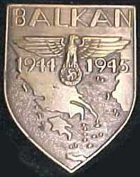 The award was designed by Benno von Arent, and consisted of a shield with a flat top and pointed bottom across the top portion of which was the work “BALKAN”. An eagle (of very poor quality) clutching a swastika, with the dates “1944” and “1945” on either side, was placed under this word and map of the Balkan area fills the rest of the badge. Whether or not the shield was ever presented is under debate though Mr. Aisby states in “Word War II German Medals” that SS Obersharfuhrer Fredrich Olesh (who formed part of the Prins Eugen division) told him that he personally awarded approximately 250 Balkans shields. |