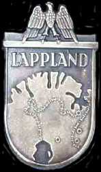The award itself consisted of a crudely constructed shield which had a rounded bottom and a flat top, with a rim running along the edge of it. Immediately below the top there was a horizontal bar with an eagle perched on it. The eagle in the shield does not include a swastika, as this of course would have been unacceptable to the Allied forces. Immediately beneath this is the word “LAPPLAND” and under it there was a map of the area. On the edges of it four small holes were perforated from which the shield was sown to the uniform. Needless to say, this award has countless variants and, being field produced, was of a very low quality. |