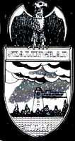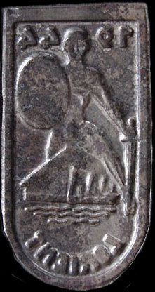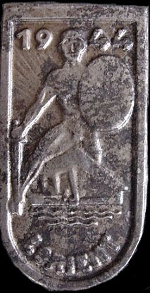 The circumstances and institution date of the shield are not exactly known, but it was toward the end of 1944 that General Fahembacher authorized the commemorative award (it was only locally authorized). The shield itself had a flat top and rounded bottom, with its main feature being a nude warrior wearing a German helmet, who held in his left hand an oval shield, and in his right hand a double-edge sword. The shield he holds is adorned with an eagle clutching a swastika. The warrior is standing on a u-boat pen with a u-boat coming out of it. Waves in three lines are below the u-boat pen. The shield was crudely constructed in the base from whatever materials were available, and enough were made for about half the garrison. It was sown to the uniform by way of four small holes drilled in the corners.