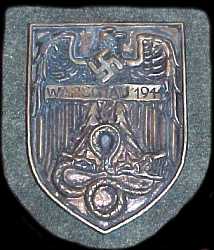 The Warsaw shield was instituted on December 10th, 1944, and was to be presented to members of the Wehrmacht and auxiliary forces who participated in combating the rebellion in that city during August 1st and October 4th of that year. The troops, under the command of SS Obergruppenfuhrer unf General der Polizie Erich von dem Bach-Zelewiski ,battled the free Polish army and used brutal force in putting down the rebellion. Two SS divisions in particular, the 29th Ukrainian volunteers under Bratislav Kaminski and the 36th under Dr Oskar Dirlewanger, committed such appalling acts that a few of the worst offenders were executed for discreditable conduct. One can imagine the severity of the acts that compelled the Warsaw commander to take such drastic action at this late stage of the war. As it is often the case in battles involving partisan, however, atrocities went both ways. In this hard fought battle no quarrel was asked for or given on either side.