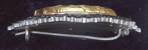 These early examples, as well as those slightly later pieces with six rivets also manufactured by Deschler, featured a very fine and, compared with later pieces, quite flimsy pin fitting.