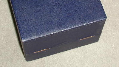 ceremony. Note the presentation boxes. When the collector encounters this very scarce accessory it will invariably be the type covered in blue leatherette, pictured below. Boxes in red, said to be early war issue, are extremely rare. |