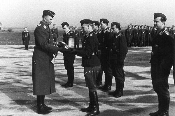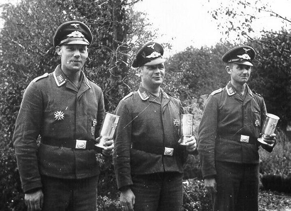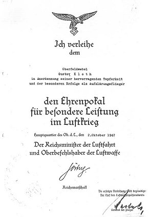 The Ehrenpokal was awarded until December 1944, but from around June 1943 the actual presentation of the goblet was less likely to occur .... Davis (1992) records that "it appeared that it was no longer possible to manufacture the required number of goblets due to the demands of the war". In these cases, however, the urkunde was presented and an appropriate entry made in the Soldbuch and Wehrpass. |