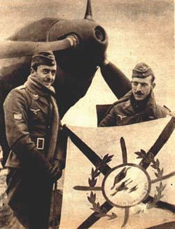 Right, Blue Squadron pilots display their flag which reads "Vista, Suerte y al Toro". Above, inspecting a Bf 109, notice the "España" patch on the right arm. Sebastián Bianchi Collection
