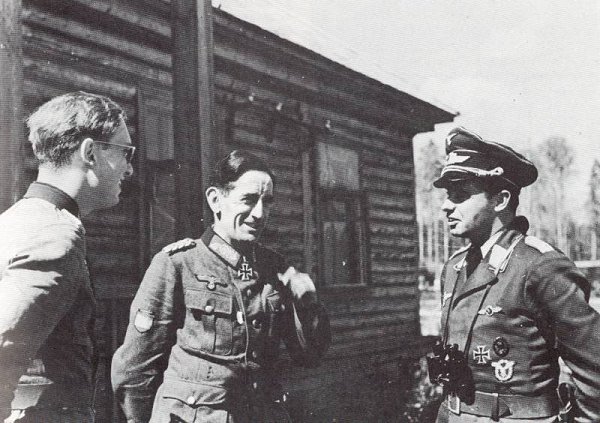 General Augustin Muñoz Grandes, leader of the Blue Division, shares a laugh with Luftwaffe personnel. |