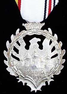 The “Blue Division Medal” was die struck in zinc alloy with a bronze wash. It was produced by the Deschler und Sohn firm, and measured 32mm in diameter and 1mm in width.