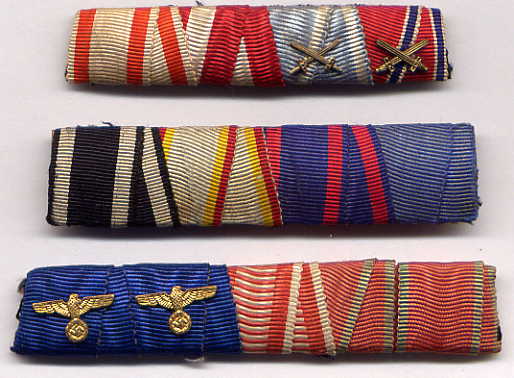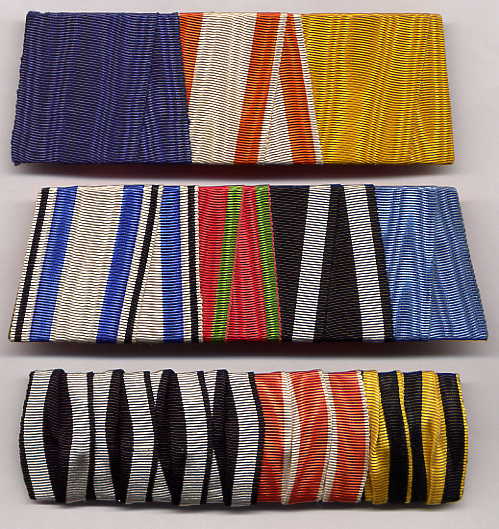 The top bar might seem to be mismounted, but what we have here is a regulation bar for an Offizier-Stellvertreter or Feldwebelleutnant, correctly wearing his Prussian XV Years Service Cross before a Red Eagle Order MEDAL, and then 1897 Wilhelm I Centenary Medal. The middle bar is unusual, since Bavarian officers did not often wear this Prussian style. With no devices, the last ribbon could be a Prussian Crown Order (peacetime) or a Württemberg Friedrich Order-with or without swords. The last bar is a typical South German style, here for the Prussian Iron Cross, Prussian Hohenzollern House Order with Swords (probably), Prussian Red Eagle Order, and Württemberg Military Merit Order. There are clips under the obverses of each ribbon for conversion to a full-size medal bar, as was common, but this piece obviously was never used that way.