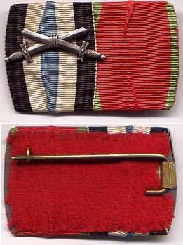 Here is a variant of the South German style (more found later in this article), showing what at first appears to be a "homemade" bar bizarrely using the full sized swords removed from the actually Bavarian Military Merit Cross 2nd Class with Swords (here on the "war merit" rather than "bravery" ribbon), and only a SINGLE drape of each ribbon rather than the normal doubled folds. Yet these swords and style bar were commercially available into the 1930s.