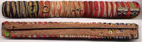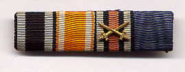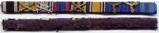 This unusual style ribbon bar was probably NOT worn in uniform, but rather on the lapel of a civilian jacket. It is not a naval trapezoid style, but rather a miniature of the old enlisted men's full size parade dress medal bar. Note the hooks on back for wearing miniature awards. There is no sin that miniatures were ever worn, and the swords device would not have been proper if the cross itself WAS worn. So this may have been worn as a ribbon bar after all.
