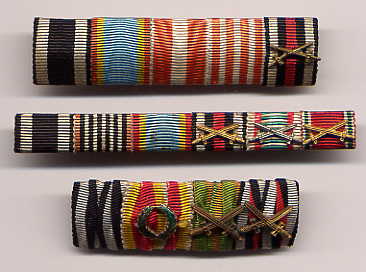 Less impressive-and also in compliance with period regulations (!) are these three ribbon bars, dating 1935-38. The top and bottom bars certainly belonged to ex- or recalled officers, and all indicate that the wearer was obviously wearing uniform of some kind.