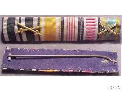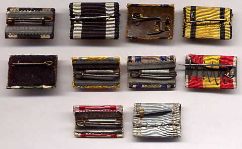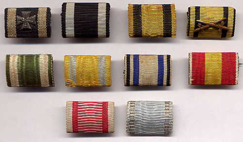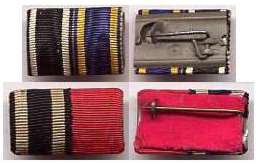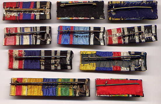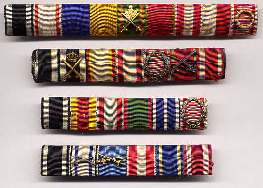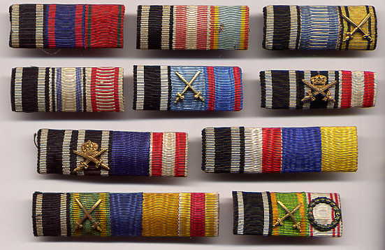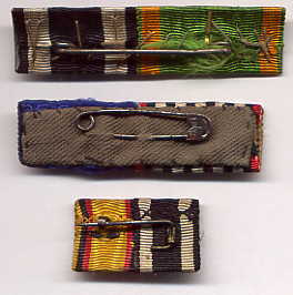 The regulations of 1915/16 never actually mentioned the WIDTH the new reduced size ribbon bars were to be, only their HEIGHT- 17 mm.  The 15 mm width already used for lapel bows and naval trapezoids was an obvious choice, and became the standard size until 1945, though 25 mm was also popular- and the only width used for single ribbon bars.  In many cases, soldiers simply snipped off lengths of the ribbon that had come with their presentation awards and improvised field ribbon bars.  Sewn on ribbon bars also existed from the beginning, though a distant third in popularity, for obvious reasons.