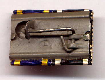 This variety was normally only used much later to "squeeze" many awards (see In Wear Photo Gallery) onto a single row of ribbons.  It was scarce in any period.  This is an enlargement of the reverse, showing the Feldgrau detachable tab bar construction, with "DRP" markings in the center running sideways bottom to top.
