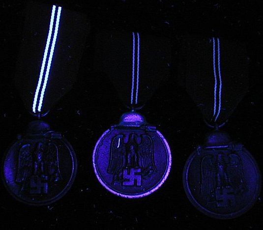 A helpful tool to help determine the authenticity of a paper or cloth item from the Third Reich era is the "black light test". Generally speaking, original ribbon or paper items made during the Third Reich may be distinguished from those made since by the fact they will not fluoresce under a black light. While Paper items made prior to 1945 will not "glow", those made since the early 50's generally do fluoresce due to the amounts of chemical bleaches and dyes utilized. Similarly, cloth items that contain synthetic fibers or florescent dies will also incandesce under black light and these types of materials were not generally used during World War II.