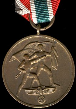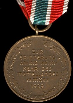 To commemorate the occupation the "Memel Medal" was authorized on May 1, 1939. This, the last of the Anschuluss awards, was also designed by Dr. Klein. The obverse is the exactly the same as the above medals. The reverse reads “Zur Erinnerung an die Heimkerhr des Memellandes 22. Marz, 1939 (to commemorate the return of the Memel area on March 22,1939), surrounded by an Oak Leave wreath. The award was presented to all military, political and civil Personnel who had distinguished themselves in actions related to the returning of the district to Germany.