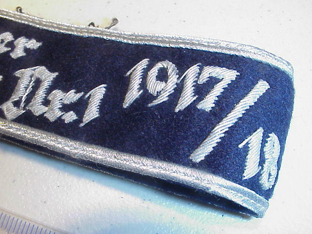 A variation also exists in hand-embroidered aluminum thread with aluminum Russia-braid, which reads “Jagdgeschwader Frhr. v. Richthofen Nr. 1 1914/18". This example is in the Luftwaffe Museum in Gatow, Berlin. It is not known who the original wearer was.