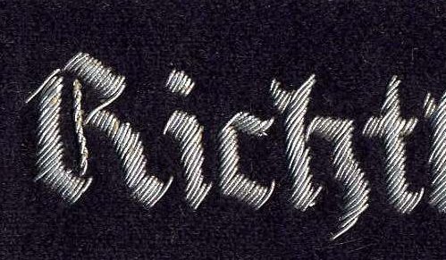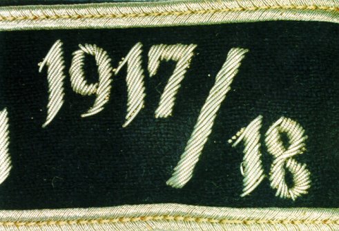 This piece was relatively short-lived and was replaced on 29 October of the same year (Luftwaffen-Verordnungsblatt Nr 43, Order Nr 816) by a special commemorative cuffband for those who could establish proof of their service with the Richthofen unit in World War I. The new cuffband bore the inscription “Jagdgeschwader Frhr. v. Richthofen Nr. 1 1917/18” (Fighter Wing Freiherr von Richthofen No. 1) in two rows of text. Like its predecessor, it featured a 3mm wide strip of Russia-braid edging on either border. “Richthofen” commemorative cuffbands were normally offered in hand-embroidered aluminum thread, but could also be found in the enlisted men’s machine-embroidered style with silver-grey Russia-braid edging. The Russia-braid on the officers’ version has been observed in both aluminum and silver thread. The silver edging is normally found tarnished and has a golden shade to it.