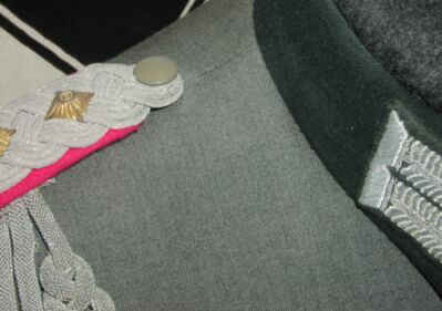 1)  The backward shoulder boards.  Shoulder boards with braided tress were to be worn in mirror image pairs with the 'short' side facing to the wearer's front.  However, I have a field tunic for a General Staff Oberst that has the shoulder boards worn 'backwards.'