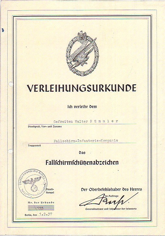 Formal award document (Verleihundsurkunde) for the Army paratrooper badge. These documents were awarded only twice, on September 01, 1937 and December 18, 1937. All members of the FIK / FIB who completed/passed the jump course after these dates, were given the badge and the license, but not the formal award document. A total of approximately 400 documents were awarded. The document is in the DIN A4 format and is signed by Generalleutnant Roese, Inspekteur Der Infanterie.