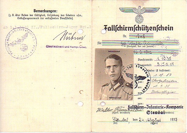 The jump license (Fallschirmschützenschein) was awarded to all trainees who successfully completed the 6 jump training course. The first lisences were awarded one week before the first badge award documents ( August 24th, 1937 ), and the second group of licenses were awarded on the same day ( December 18th, 1937 ) as the second ( and final ) group of badge award documents. Here is one of the first Army jump licenses, awarded to Walter Rümmler on 24.8.37. There was also a Fallschirm Infanterie Bataillon version of the license which had a variant national emblem and font.