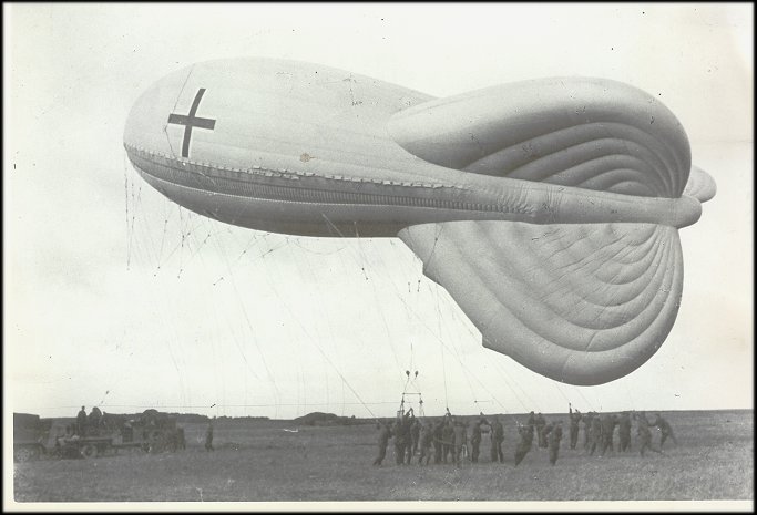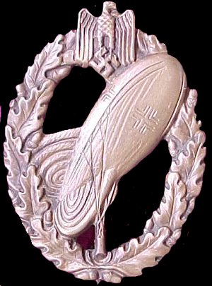 The badge consists of a wreath of oakleaves and acorns surmounted by the national emblem. An observation balloon floating at a 45° angle is featured in the center. The front of the balloon extends to the outermost right edge of the wreath. Original examples are die-struck.