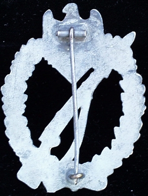 The Infantry Assault Badge measures 46mm across and was slightly convex with either a solid or hollow back, and could be die stamped or cast. The reverse had a vertical pin with a hinge that was attached to the back of the eagle, with a retaining "C" clip which retained the clip. The method of attachment for the clip varied, some were welded or soldered while others had a more elaborate scheme where the pin sits in a recessed location the edges of which are crimped in order to hold the hinge in place (pictured above in the Bronzed version).