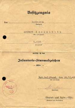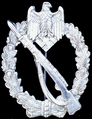 The silver Infantry Assault Badge was awarded to enlisted men, officers, NCO's of rifle companies (not in Motorized Infantry Divisions) and Mountain Troop companies. As mentioned above on June 1, 1940, the Bronze Infantry Assault Badge was instituted for Motorized Infantry regiments. To view the story of a recipient, please see the Rudolph HillebrandAward criteria was as follows: