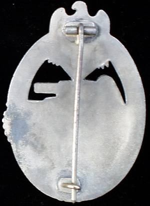 The reverse of the badge has three variations, the badge could either be hollow backed, flat, or semi-dished. The hollowed backed variation showed the imprint of the obverse, while the flat was just solid (pictured here). The semi-dished version has a slight indent that shows part of the outline of the tank. The badge was attached to the uniform via a hitch and hook, which were affixed to the reverse and had a couple variations.There was the conventional soldering of a small rectangular medal bar (pictured here), as well as the more rare type in which a circular ball hinge was inserted into the body of the badge.