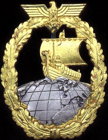 The Auxiliary Cruiser Badge, designed by Ernst Peekhaus of Berlin, portrayed a Viking ship sailing on the Northern hemisphere of the globe surrounded by a wreath of